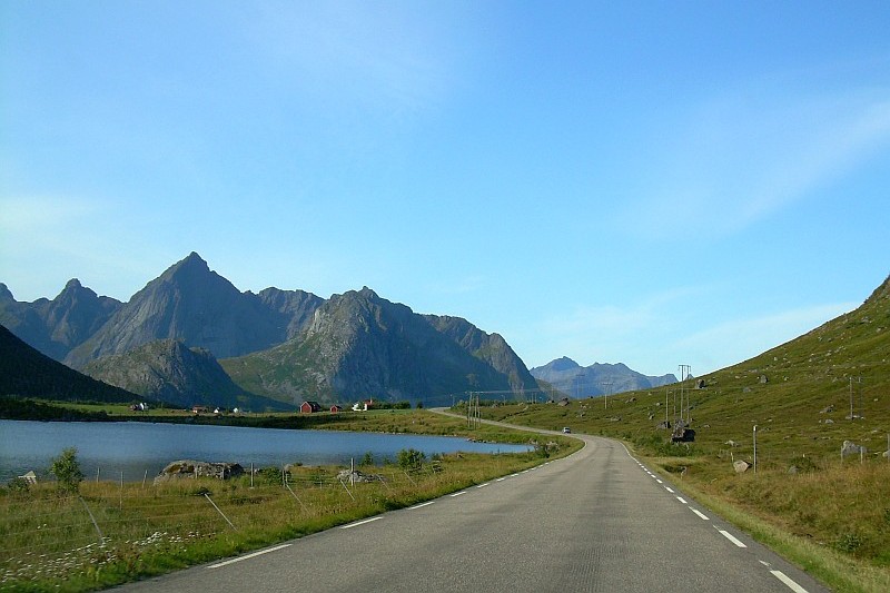 Widok z głównej drogi przebiegającej przez Lofoty.
