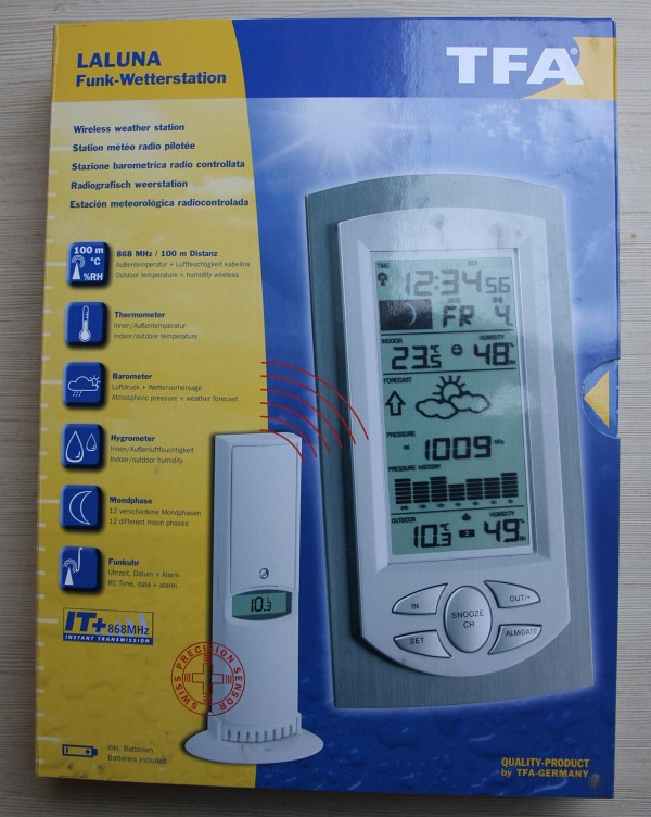 Opis stacji pogodowej TFA Dostmann "Laluna" Firma TFA Dostmann jest znanym producentem stacji pogodowych cieszących się na rynku dobrą opinią. W jego ofercie znajdziemy wiele produktów, od tych tańszych o ograniczonych funkcjach aż to bardziej rozbudowanych stacji potrafiących dokonywać np. pomiarów opadów czy też prędkości wiatru. Z racji tego, że mieszkam w bloku i mam dość ograniczone warunki pomiarów, od razu odrzuciłem stacje, które wymagają do montażu większej ilości przestrzeni - chodzi tutaj o wyniesienie na zewnątrz dodatkowej aparatury pomiarowej. Zdecydowałem się tylko na pomiar temperatury zewnętrznej oraz wilgotności i ciśnienia, przy czym priorytetem miała być dokładność pomiarów. Na rynku istnieje wiele rozwiązań tego typu różnych producentów, jednak po lekturze for internetowych skutecznie zniechęciłem się do produktów tanich i mało znanych firm. Oczywiście w cenie, którą chciałem przeznaczyć na sprzęt, nie oczekiwałem pomiarów o dokładności laboratoryjnej, ale stopień czy dwa różnicy temperatury to jak dla mnie zbyt duży rozrzut, który nie wchodził w rachubę - a takimi rozrzutami najprawodpodobniej będą charakteryzowały się niskobudżetowe produkty z hipermarketów czy składów budowlanych. Tak więc po teoretycznym przygotowaniu się, spędzeniu wielu godzin na czytaniu i poradach innych, zdecydowałem się nabyć stację pogodową "Laluna", firmy TFA Dostmann. Informacje w sieci o niej są dość skąpe, niemniej z tych dostępnych, można było odnieść pozytywne wrażenia... Pierwszym problemem, na jaki się natknąłem przy zakupie, to ograniczony dostęp do tego sprzętu w Polsce. O zakupie z półki sklepowej mozna sobie pomarzyć, w sieci dostępny był tylko w jednym sklepie internetowym (listopad 2010) oraz na jednej aukcji allegro. Zdecydowałem się (z racji 40 zł. niższej ceny) za zakup w sklepie i po paru dniach już miałem przesyłkę u siebie... Stacja znajduje się w przypominającym album pocztowy, płaskim pudełku.