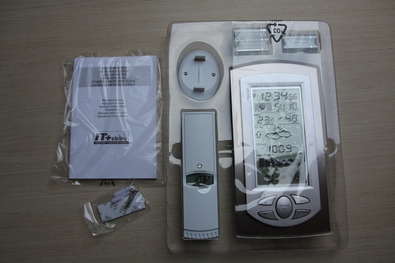 W środku pudełka znajdziemy: • samą stację, • zewnętrzny czujnik pomiaru wilgotności oraz temperatury, • podstawkę pod czujnik, • komplet baterii (3 sztuki do stacji i 2 do czujnika zewnętrznego), • instrukcję w paru językach (brak polskiego), • przylepiec, dwie śruby i dwa kołki do przymocowania czujnika do ściany. Po rozpakowaniu całości czas na włożenie baterii. Stacja cichym piknięciem sygnalizuje swój start i właściwie od razu zaczyna pokazywać źle ustawiony czas i ciśnienie oraz temperaturę wewnętrzną i wilgotność. Na razie nie wiem, czy sa właściwe, ale organoleptycznie rzecz biorąc, wydają się prawdopodobne. Ponieważ na razie też nie uruchomiłem czujnika zewnętrznego, na dole ekranu stacji w miejscu, gdzie powinny być wyświetlone wartości jego pomiarów, pojawia się "---", czyli brak danych. Żeby włożyć 2 baterie do czujnika zewnętrznego, należy odkręcić śrubkę i podważyć klapkę. Czynność jest trywialna i po chwili także czujnik zewnętrzny na swoim maleńkim ekraniku zaczyna wyświetlać temperaturę i wilgotność. I tutaj następuje małe rozczarowanie - o ile wilgotność wkazywana na stacji i na czujnku zewnętrznym jest praktycznie taka sama, o tyle temperatura odczytu różni się o ponad 2 stopnie! Czujnik leży 5 cm. obok stacji i pomimo 5,10 minut nadal różnica wynosi 2 stopnie. Jestem nieco zaniepokojony, ale postanawiam zestawowi dać szansę i wracam za 2 godziny. Tak jak sądziłem - temperatura obu czujników się wyrównała i teraz wskazywana różnica to 0.2 stopnie Celsjusza. Jak dla mnie bardzo akceptowalna. Ciśnienie dalej niewłaściwe, ale to kwestia dalszych ustawień. Pomimo, że włączone są zarówno sama stacja jak i czujnik, to na stacji dalej jest brak wyświetlanych danych z czujnika zewnętrznego. Krótki rzut oka do instrukcji i już wiadomo co trzeba zrobić. Otóż na samym początku trzeba uruchomić czujnik, a dopiero potem stację. Należy to zrobić w ciągu 2 minut, wtedy stacja przy starcie znajduje sygnał czujnika, dopasowuje szyfrowanie i zaczyna wyświetlać dane - i to praktycznie po kilkunastu sekundach. Tutaj parę słów o samej transmisji. Zrealizowana jest ona w techologii IT+ 868 MHz, co niesie za sobą częstszą aktualizację danych (co parę sekund), większą odporność na zakłócenia oraz mniejszy pobór prądu i dalszy zasięg (do 100 metrów w terenie otwartym). A jak zasięg czujki zewnętrznej wygląda w praktyce?