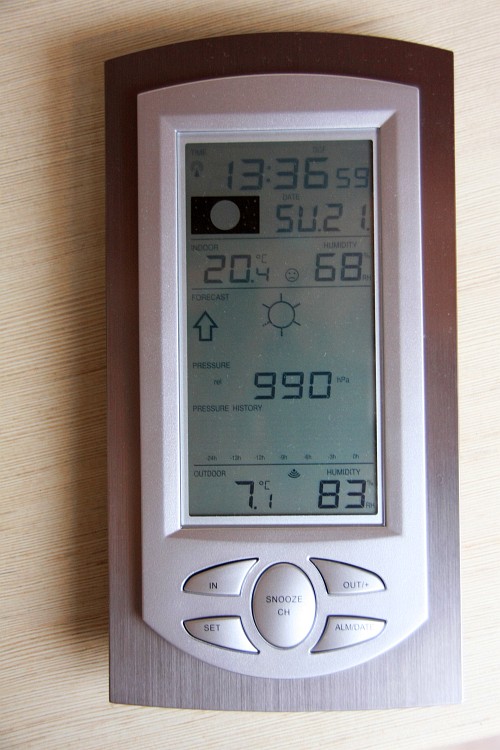 Wróćmy teraz do samej stacji. Wyświetla ona odczyty z czujnika zewnętrznego na dole ekranu, po lewej stronie temperaturę, po prawej wilgotność względną R.H. wyrażoną w % oraz pośrodku znaczek dostępności sygnału. Stacja potrafi obsłużyć maksymalnie 3 czujniki zewnętrzne, wtedy pod znaczkiem sygnału będzie dodatkowo wyświetlana informacja, z kórego czujnika jest prezentowany odczyt. Niestety, ale nie da się wyświetlać odczytów jednocześnie z 3 czujek zewnętrznych - przełączamy się pomiędzy nimi przyciskiem Snooze. Powyżej informacji z czujki (czujek) zewnętrznych, znajduje się dobowy wykres zmian ciśnienia oraz tuż nad tym - aktualne ciśnienie. Fabrycznie ustawiona wartośc to 1013 hPa, należy dokonać korekty tego parametru na wartość aktualną w danym regionie (ja się posiłkowaniem odczytem ze stacji pogodowej uniwersytetu w Białymstoku) - dopiero wtedy stacja będzie prawidłowo pokazywała zmiany ciśnien. Strzałka po lewej symbolizuje wzrost lub spadek ciśnienia, a pośrodku ekranu jest graficzne (i animowane) przedstawienie pogody. To jest swojego rodzaju bajer, ponieważ to, co będzie tam wyświetlane (słońce, chmury, deszcz etc.), zależy od obliczeń samej stacji na podstawie tendencji wzrostowej ciśnienia, wilgotnośći i być może temperatury, a jak wiadomo, wyliczenia mają się czasami nijak do pogody. Ten element należy więc traktować z pewnym przymrużeniem oka. Nad graficznym przedstawieniem pogody znajdują się odczyty temperatury i wilgotności wewnętrznej z czujnika umieszczonego w samej stacji. Pośrodku pomiędzy nimi wyświetlana jest smutna lub uśmiechnięta buźka, a jej humor zależy od tego, jakie aktualnie są te wartości i w jakim przedziale się zawierają. Mało przydatny gadżet. Na samej górze wyświetlacza, w lewym górnym rogu, widzimy sygnał dostępności sygnału DCF-77; w dużym mieście w połnocno-wschodniej Polsce, na 4 piętrze bloku, synchronizacja czasu następuje w "Lalunie" po starcie w ciagu 2-3 minut i cały czas wyświetlany jest znak dostępności sygnału. W określonych godzinach czasu stacja koryguje swój czas w stosunku do czasu odebranego z nadajnika spod Frankfurtu i jeśli tylko nie ma problemu z odczytem, będziemy mieli w domu najbardziej dokładny zegarek :-) Dzięki dostępności syganału DCF stacja ustawi też nam właściwą datę, jesli jednak z jakiegos powodu sygnał nie będzie osiągalny, godzinę i datę będziemy musieli wprowadzić ręcznie. Obok daty wyświetlany jest też dzień tygodnia oraz aktualna faza księżyca. W miejscu daty wyświetlany jest też alarm, w zależności od tego, czy jest włączony czy nie. Dźwięk alarmu jest dość piskliwy i może z powodzeniem służyć jako budzik - niestety nie ma możliwości ustawiania alarmu na poszczególne dni tygodnia, za to jest działająca funkcja drzemki, co może ucieszyć śpiochów. I na koniec tej mini recenzji, trochę napisanej na wspak, parę słów o wyglądzie stacji. Wiadomo, że o gustach się nie dyskutuje, ale mi osobiście stacja się podoba. Jest cała z tworzywa sztucznego stylizowanego na aluminium i nie sprawia wrażenia tandetnej. Przyciski wciskają się z pewnym oporem, ale pewnie. Przyczepić się za to mogę do podświetlenia, które jest bardzo słabe, choć pozwala w nocy odczytać informacje z wyświetlacza. Są to umieszczone z prawej strony LCD trzy delikatne zielone diody, które zapalają się na parę sekund po naciśnięciu jakiegokolwiek przycisku na stacji i gasną po chwili samoczynnie. Dość słaby jest też wyświetlacz, posiada 7 stopni regulowania kontrastu i na wyższych wartościach do jakości wyświetlanych informacji nie można się przyczepić, za to kąty widzenia mogłyby być zdecydowanie lepsze.