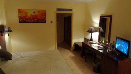 Nad recepcją. Po szybkim posiłku i przyznaniu numeru pokoju czekamy, aż ktoś nas zaprowadzi i zawiezie nasz bagaż. Jak zwykle trwa to nieprzyzwoicie długo, a po pierwszej w nocy wydaje się dłużyć niemiłosiernie. W końcu się udaje - stajemy pod numerem 2263. Wchodzimy do pokoju, wszystko jest czyste, nowe, pokój przypomina układem ten z Titanica, to prawie jego kopia... Po lewej szafa w korytarzu, darmowy sejf, po prawej łazienka - duże lustro, suszarka do włosów, prysznic ze zdejmowaną rączką (co mnie najbardziej cieszy, nie podzielam rozwiązań z zamontowanym na stałe prysznicem). Dalej pokój - dwa osobno stojące łóżka (złączą je, jeśli poprosicie), na wprost dwa fotele, duża szafka z lustrem nad, telewizor LCD (TV polonia w kiepskiej jakości), mała lodówka, klimatyzacja w zabudowie. No i duży balkon - wychodzimy sprawdzić, czy rzeczywiście "wszyscy dostaną dobre pokoje" :-)