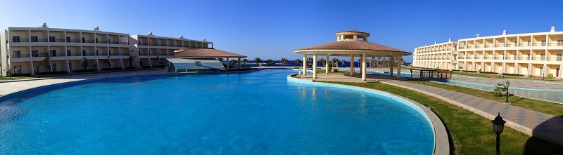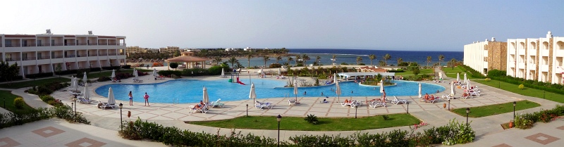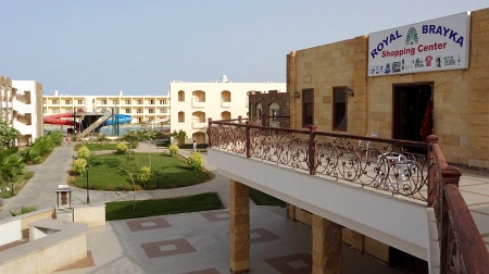 Panorama z tarasu lobby baru w kierunku morza. Śniadania w Royal Brayce serwowane są w godzinach 7-10 rano, obiady 13-15 i kolacje 19-22. Na terenie hotelu istnieje jedna główna restauracja nazwana Fleming's, znajduje się ona tuż obok recepcji. Nad nią jest lobby bar, sala konferencyjna i małe boksy biur podróży. W tym samym budynku znajdziemy również duży sklep z "pamiątkami" z Egiptu oraz innymi bardziej lub mniej przydatnymi rzeczami (olejki do opalania, materace, czapki itp). Nie ma zbyt dużego wyboru, a ceny są sporo pozawyżane, ale jest to jedyny sklep w okolicy, więc jeśli nie chcemy specjalnie gdzieś wyjeżdżać na zakupy, jesteśmy na niego skazani (najbliższy inny sklep jest około godziny drogi piechotą, niestety nie znam tam cen). Pomiędzy lobby barem a sklepem jest otwarta przestrzeń z dwoma stołami do ping ponga i jednym stołem bilardowym. Są one darmowe. Dalej na lewo stoi kolejny budynek, w którym na dole jest salon masażu, a na górze siłownia. Siłownia jest dobrze wyposażona i darmowa, masaż oczywiście płatny (pierwsze 15 minut masażu w dniu przyjazdu jest darmowe). Osobiście nie korzystałem z jego dobrodziejstw, ale zasłyszane informacje od tych co tam byli, przepełnione były dużym uznaniem dla masujących. Po plaży chodzi bardzo miły pan Carlos i zachęca co ładniejsze i mniej opalone panie do korzystania z usług Welness Center.