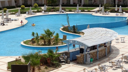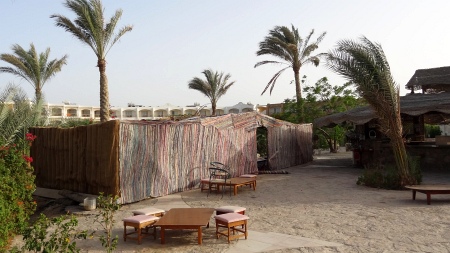 Namiot do palenia shishy. Stara część Brayki. Jeszcze bliżej plaży znajduje się kolejny mały basenik, ale szczerze mówiąc nawet tam nie zaszliśmy - chociaż codziennie idąc na plażę przechodziliśmy obok niego. Tuż obok plaży znajduję się też mini "amfiteatr", gdzie wieczorami urządzane są animacje. Animacje są po włosku, czasami tylko było słychać jakieś piosenki po angielsku. Generalnie jednak wieczorami ruch w Royal Brayce koncentrował się wokół lobby oraz drink baru, przy animacjach nie było zbyt wielu ludzi. Prawdopodobnie bardzo duża część hotelowych gości wieczorem szła do starej Brayki. Stara Brayka jest bardziej zielona, w nowej część drzew jest świeżo posadzona i jeszcze nie zdążyła się rozrosnąć. Po stronie starego hotelu jest też "beduiński" namiot, gdzie za 10 funtów egipskich można wieczorem zapalić shishę (płaci się potem w recepcji). Jest w nim fajny klimat i można miło spędzić czas. Ogólnie rzecz biorąc goście z Royal Brayki mogą korzystać prawie ze wszystkiego w starej Brayce - wyjątki to restauracja główna, gdzie nie można jeść posiłków oraz nie można zajmować leżaków. Poza tym wszystkie np. napoje w przyplażowych barach mogą zamawiać bez problemu (z alkoholem włącznie), mogą korzystać z basenów itd. - tym samym więc cały kompleks Brayki jest do dyspozycji klientom Royal Brayki.