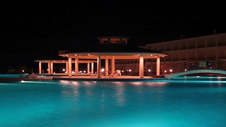 Nocą. Zawodzi nieco za to drink bar (pool bar) przy restauracyjnym basenie. Bar ten jest czynny do 23, serwują w nim lokalne alkohole, wodę, napoje gazowane, jakieś ciastka i kanapki, jakby ktoś zgłodniał pomiędzy posiłkami - w godzinach 10:30-12.30 jest tam tzw. późne śniadanie. Jedzenie jest bardzo minimalistyczne, wręcz symboliczne, ale nawet nie o to chodzi. Największe zastrzeżenie można mieć do samej obsługi, która w tym barze w połowie naszego wyjazdu się zmieniła, a nowa nie stanęła na wysokości zadania. Może przesadzam, ale czekanie 10 minut na napój z automatu, kiedy przy barze nie ma nikogo oprócz mnie, przekraczało moją cierpliwość... generalnie jednak bar ten jest fajnym rozwiązaniem dla tych, którzy z jakiegoś powodu wybiorą basen zamiast morza. Przy drink barze przy basenie jest duży baniak z wodą, jakby Wam zabrakło wody w pokoju zawsze można do niego podejść i samemu nalać sobie do butelki. Drugim miejscem, gdzie możemy to samo zrobić, jest lobby bar nad restauracją, który jest dłużej czynny niż drink bar. Przy drugim basenie są kolejne dwa drink bary, ale w momencie kiedy byliśmy w Brayce, były zupełnie nie urządzone i nic tam się nie działo - odpalone były tylko same baseny, ale świeciły pustkami i można było zupełnie samemu się w nich wykąpać. Być może na wakacjach będzie tam większy ruch, na razie jednak miejsce sprawiało wrażenie lekko wymarłego. Przy tych basenach są wybudowane dwie czy trzy malutkie zjeżdżalnie, dla dzieciaków to zawsze jakaś dodatkowa atrakcja, ale były one czynne bodajże tylko parę godzin dziennie.