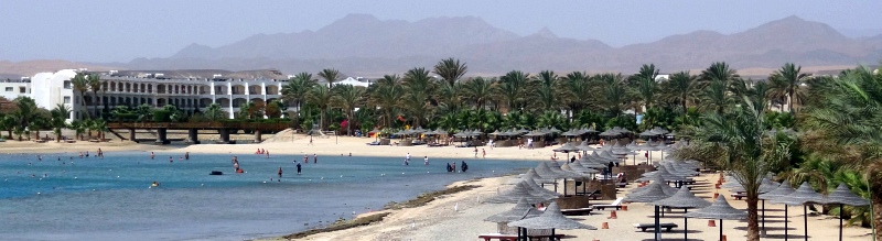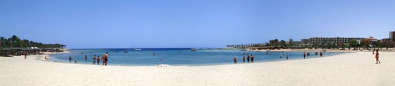 Część zatoki Brayki widziana od strony "starego" hotelu. Tej niedogodności pozbawione są hotele położone nad zatokami, takie właśnie jak obydwie Brayki, Hilton czy Swiss Inn. Nawet przy silnym wietrze woda w zatoce pozostaje w miarę spokojna i można bez problemu snurkować (pod tym kątem zatoka Brayki jest lepsza od Abu Dabbab - ostatniego dnia tak mocno wiało, że w Abu wywieszono czerwoną flagę, w tym samym czasie w Brayce było o wiele, wiele spokojniej. Jest to spowodowane tym, że zatoka Brayki jest mniejsza i mniej otwarta na morze. Zatoka Abu Dabbab zbiera z pełnego morza o wiele większe fale). Plaża w Brayce jest piaszczysta z drobniutkimi kamyczkami, wejść do wody można od przodu (czoła) zatoki, po bokach jest rafa i wchodzić nie można (stoją zakazy), dlatego też leżaki są zajęte głównie z przodu (przy samej Royal Brayce leżaki świeciły pustkami). Dno opada powoli, w wodzie jest także piaszczyste, więc spokojnie mogą się kąpać nawet nieumiejący pływać.
