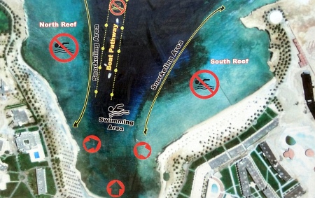 Źródło: tablica na plaży. Temperatura wody w morzu czerwcu to 26-27 stopni, więc jest jak w polskich krytych basenach (chociaż woda w miejscowych basenach była chłodniejsza niż w morzu). Temperatura na zewnątrz w dzień to około 40 stopni Celsjusza w cieniu, ale z racji tego, że wieją wiatry oraz powietrze jest suche, jest bardzo przyjemnie. W nocy temperatura spadała do około 30 stopni. Niebo przez cały nasz pobyt było bezchmurne i nie udało mi się wypatrzeć ani jednej, choćby najmniejszej chmurki... W zatoce wydzielone są miejsca do klasycznego pływania, snurkowania oraz korytarz, w którym pływają motorowymi pontonami miejscowi płetwonurkowie z centrum nurkowego Extra Divers (ich siedziba znajduje się w starej części Brayki). Strefa snurkowania obejmuje rafy po dwóch stronach zatoki, można snurkować aż do otwartego morza. Z miejscowych informacji wynika, że nie należy pływać w korytarzu przeznaczonym dla motorówek, ale wielokrotnie zmieniałem rafę i przepływałem z jednej strony zatoki na drugą i nikt nie zwrócił na mnie uwagi - ale oczywiście sugeruję mieć oczy wokół głowy, żeby nas przypadkiem nie oskalpowała śruba przepływającej akurat łodzi...
