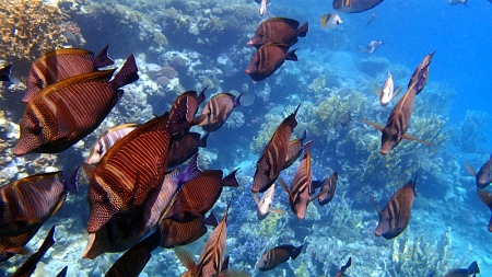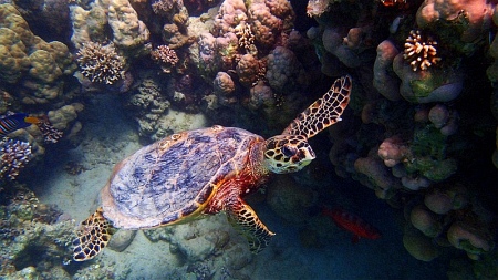 Podpis chyba zbędny... :-) Co do samej rafy to oczywiście jest to zupełnie inna liga niż "rafa" w Titanicu. Pokuszę się nawet o stwierdzenie, że miejscami była ciekawsza niż to, co widzieliśmy poprzednio w Hurghadzie nawet ze statku! Wstając wcześnie rano można spotkać mureny, ośmiornice, dużo skrzydlic, ogończy oraz tysiące mniejszych i większych ryb - od ich ilości i kolorów momentami może zaboleć głowa :-) Żołwi nie spotkałem w tej zatoce, chociaż pływałem w niej przez cały nasz pobyt, o różnych porach dnia, w sumie dobrych kilkanaście godzin. Żółwie na pewno były w zatoce Gebel El Rosas, przy Oriental Hotel, do której spacerkiem brzegiem morza od Brayki jest około 15 minut drogi. Widziałem dwa duże na południowej rafie tej zatoki (swoją drogą bardzo polecam tę zatokę - jest tam mała, należąca do klubu płetwonurskiego Ducks Divers plaża, płatna 3 euro, świetne miejsce na odosobniony wypoczynek).