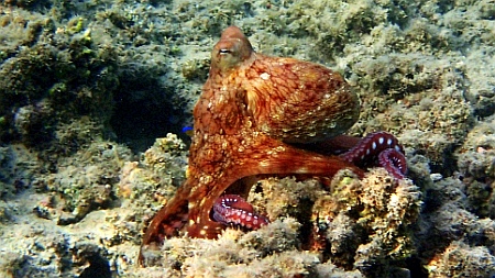 Ośmiornica Snurkować w Brayce można praktycznie od samego początku, bo już na głębokości kolan można spotkać ciekawe ryby. Oczywiście w miarę oddalania się od plaży rafa robi się coraz ciekawsza, a woda czyściejsza, bo mniej zapiaszczona przez kąpiących się (niestety, ale przy dużych wiatrach, pomimo, że fale w zatoce nie będą duże, to znacznie zmniejszy się wizura (przejrzystość) wody z powodu unoszących się drobin w toni. Kiedy wiatr cichnie, sytuacja wyraźnie się poprawia). W miarę oddalania się od plaży rośnie też głębokość zatoki, na jej końcu dno praktycznie już znika z oczu (jest tam około 30 metrów), ale rafa cały czas się ciągnie wzdłuż brzegu i jeśli tylko zbyt mocno nie buja na otwartym morzu, można spróbować snurkować poza zatokę.