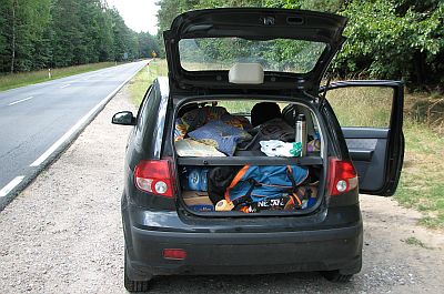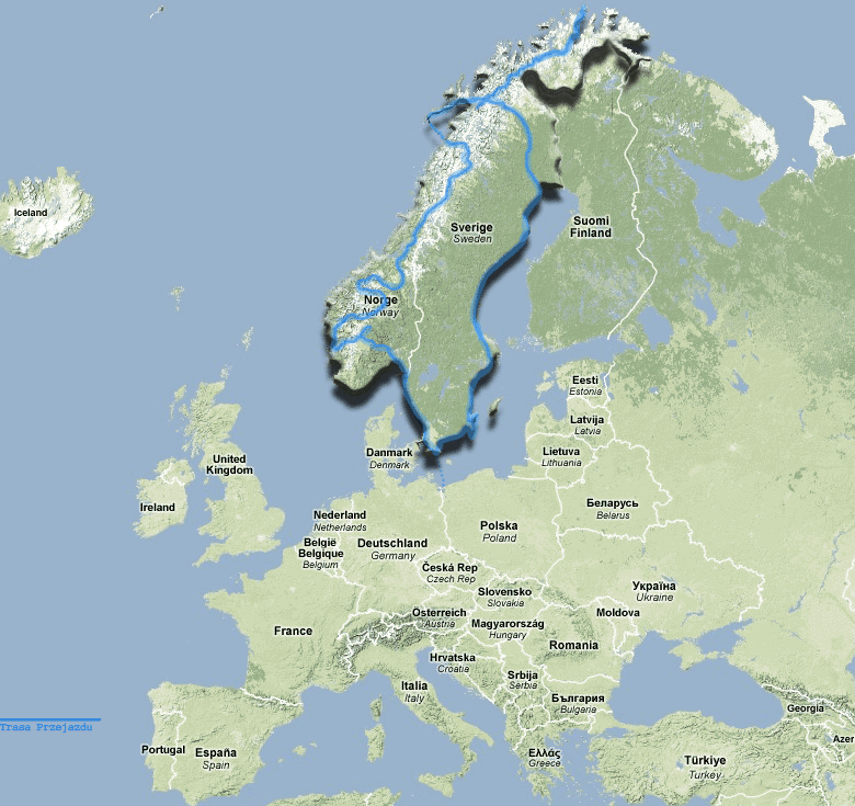 Trasa naszego wyjazdu - z Polską przejechanych ponad 10 tys. km. Pomysł wyjazdu do Norwegii dojrzewał parę lat. Wszystko zaczęło się podczas mojego pobytu w USA, gdzie stojąc nad Wielkim Kanionem Kolorado znajomy (który od lat mieszka w Norwegii) powiedział: "To jest tak piękne jak fiordy"... Muszę zobaczyć te fiordy - myślałem - bo kanion serwował przecież tak niezwykłe wrażenia. Późniejsza lektura for internetowych oraz opisów na stronach www tylko mnie utwierdziły, że Norwegia musi stać się żelaznym punktem wojaży, bo przecież tuż po Kanadzie i Nowej Zelandii przez niektórych uważana jest za najpiękniejszy kraj świata. Znając moje zamiłowanie do podróżowania i poznawania, dałbym wtedy głowę, że już następne wakacje będę spędzał na północy Europy... Niestety, minął rok, dwa, trzy, a wyjazd ciągle się odkładał, zawsze co roku coś stawało na przeszkodzie. W końcu jednak powiedziałem dość, nie można przecież odkładać, być może wycieczki życia, w nieskończoność. Na początku lipca 2008 zapadła ostateczna decyzja - jedziemy, a wraz z nią potęgująca się z dnia na dzień euforia, że to już już... Z życiem pożegnała się "świnka". Nieźle przytyła przez ostatnie półtora roku, teraz na pewno się przysłuży. Norwegia to przecież bardzo drogi kraj. W ruch poszły znowu (jak co roku) mapy, drukarka wypluwała opisy norweskich atrakcji i opisy wycieczek innych, którzy już poznali ten cudowny kraj. Nie wiadomo, co się może tam nam przydać... ważna rzecz, mapa z rzadka rozsianych stacji LPG w Norwegii - ląduje na samej górze bagażu. Dokonujemy też pokaźnych zakupów żywnościowych - zupki w proszku, szybkie do zrobienia na gorąco gotowe dania, pieczywo o wydłużonej trwałości, suszone owoce, tradycyjne konserwy itd. Jest tego cały bagażnik, w trakcie jazdy przecież też trzeba mieć coś do chrupania. Zabieram też ze sobą niezbędnik survivalowy oraz środki na komary, których ma być ponoć cała chmara. Ponieważ przewiduję spanie w namiocie na dziko, a niezbyt wyobrażam sobie codzienne rozkładanie i składanie tradycyjnego namiotu (plan zakłada każdy nocleg w innym miejscu), dokonuję zakupu namiotu firmy Quechua - który, wg zapewnień producenta, będę w stanie rozbić w ciągu 2 sekund, a złożyć niewiele dłużej, bo tylko, przy odpowiedniej wprawie, 15 sekund. Późniejsza praktyka to potwierdza. Zakup tego namiotu uważam za świetną decyzję. Namiot sprawdził się wyśmienicie. Czasu mało, więc trzeba rezerwować prom. Na tańszy rejs poniedziałkowy w Stena Line już jest za późno - wszystkie miejsca samochodowe zajęte, zostaje więc o prawie dwie stówy droższy Polferries. Szybko bukuję bilety na prom na 23.30 w nocy z poniedziałku na wtorek. Całkowity koszt podróży tam i z powrotem dla samochodu osobowego i do maksymalnie pięciu osób wynosi nas 742 zł. Nie dostaję potwierdzenia wpłaty na maila, więc dzwonię się upewnić, czy pieniądze wpłynęły. Wszystko jest OK. Robię też przegląd samochodu - przed nami długa podróż, auto musi to wytrzymać. Tego się najbardziej obawiam. Moim ostatnim marzeniem są wizyty w norweskich serwisach samochodowych. Problemu z samochodem nie uda się jednak uniknąć, ale o tym później. Kupuję też linkę holowniczą - lepiej dmuchać na zimne.