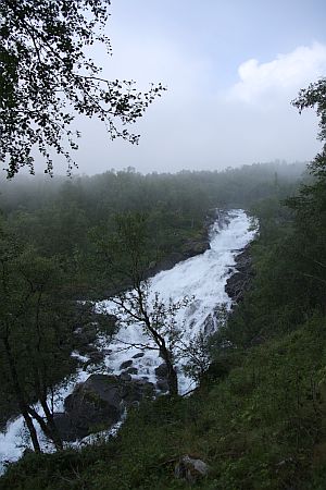 Dość szybko natykamy się na przebijający się wśród drzew po lewej stronie ogromny wodospad. Nawet z tej odległości