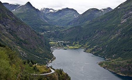 Widok z Drogi Orłów na Geiranger, w tle Dalsnibba