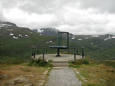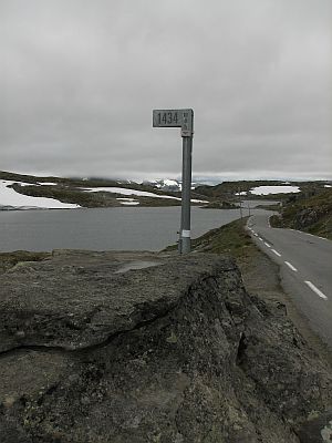 wysokość 1434 m.n.p.m i w tym miejscu jest to najwyżej w Norwegii położona droga państwowa. Miejsce jest zaznaczone