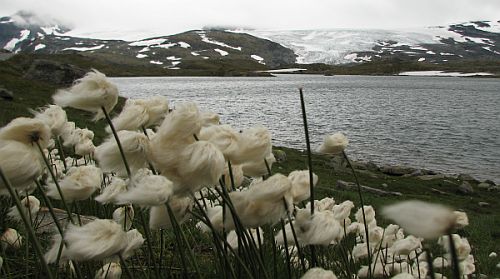 Jęzor lodowca w tle i... wełnianki