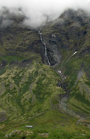 Pojawiają się porosty i trawy. Droga zaczyna gwałtowanie opadać w dół. Po prawej stronie mijamy spadający z kilkudziesięciu metrów wodospad,