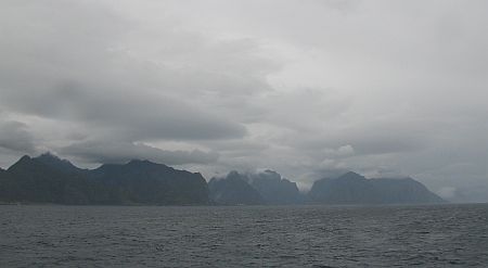 Mglisty Archipelag Lofotów wyrastający z oceanu. Widok z promu