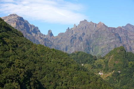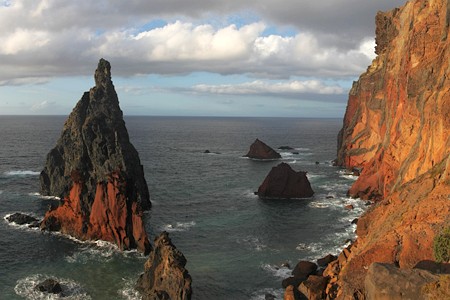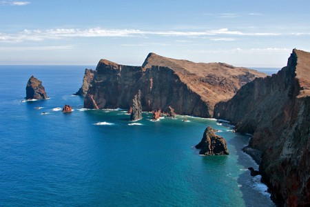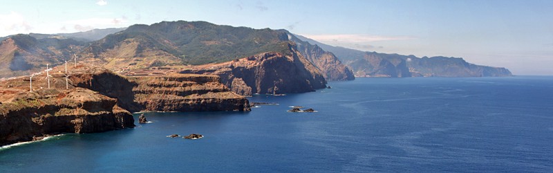 Panorama z Ponta do Rosto na wschodnie wybrzeże wyspy. Jeśli chodzi o wschód wyspy, tutaj przede wszystkim króluje Ponta de São Lourenço. Jest to, w przeciwieństwie do zielonej i ukwieconej reszty Madery, miejsce suche i niegościnne, ale właśnie w tym tkwi urok tego cypla. São Lourenço to właściwie półwysep o skalistym i strzelistym brzegu wysunięty daleko na wschód. Kończy się wyspą Ilhéu do Farol, na której znajduje się latarnia morska. Jeszcze dalej są wyspy Ilhas Desertas, które są jego naturalnym przedłużeniem, jeśli jest dobra pogoda i znośna przejrzystość powietrza, bez problemu można je wyraźnie zobaczyć.