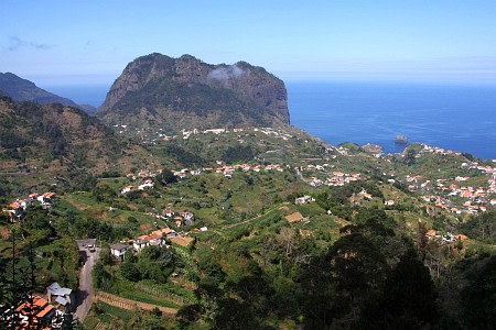 Orla Skała (Penha de Águia) z Porteli. Z Porteli warto zjechać na dół pod Penha de Águia. Na górę można wejść, chociaż ścieżki są bardzo strome. Dla tych, którzy wolą mniej męczące rozwiązanie, dół oferuje kamienistą plażę, bary, darmowy parking obok oraz asfaltową drogę, którą warto się przejść i popodziwiać świetnie w tym miejscu widoczne wybrzeże wyspy. Z Porto da Cruz można podjechać do pobliskiej Santany i jeśli ktoś jest zainteresowany miejscowym budownictwem, może przyjrzeć się z bliska drewnianym i ciekawym domom w kształcie litery A. Można też drogą 217 (świetne widoki, jeśli będziemy tu po południu, słońce będzie pod obiektyw) dojechać do Riberio Frio. Tutaj zatrzymajmy się na dłużej.