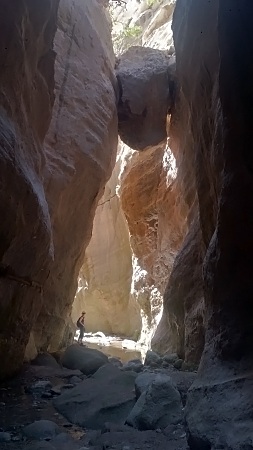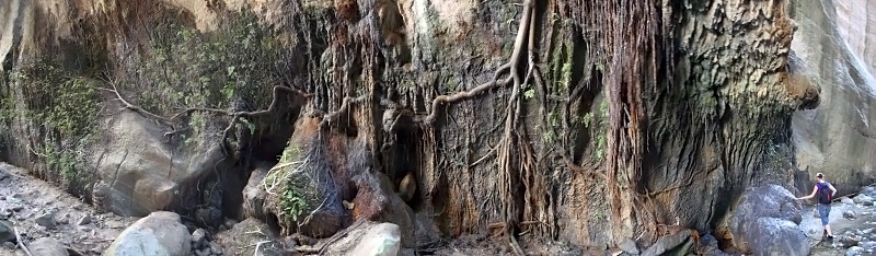 Avakas. Już od samego początku wąwóz obniża odczuwalną temperaturę o dobrych parę stopni, panuje przyjemny chłodek, wzdłuż płynie strumyk wody i wszędzie jest cień, gdzie można się schować. Rewelacja. Wędrówka wąwozem to sama przyjemność, więc nigdzie się nie śpieszymy. Ściany miejscami są pionowe, a odległość między nimi to tylko kilka metrów. Apogeum atrakcji stanowi drzewo rosnące na skale z korzeniami wijącymi się po skalistej ścianie. Możemy oczywiście pójść jeszcze dalej, niemniej po pewnym czasie ściany wąwozu oddalają się od siebie i nie ma już takich fajnych klimatów. Myśmy postanowili jednak spróbować, niestety ale nie było żadnych oznaczeń, a wąwóz powoli zaczął zamieniać się w dolinę. Nie wiedzieliśmy, czy to już koniec szlaku, czy może jednak dalej coś jeszcze będzie, ale kiedy ścieżka zaczęła momentami powoli zanikać, to w pewnym momencie uznaliśmy, że czas zawrócić. W międzaczasie na skałach pokazały się nawet kozy, niestety trzymały dystans i na bliżej niż 10 metrów nie dały się podejść. Łącznie czas przejścia od samochodu zajął nam w obydwie strony 2.5h, w trakcie których mieliśmy wiele przerw. Jeśli dobrze pamiętam, to szacowany czas przejścia (wg lokalnych informacji) tylko do samego wąwozu to ok. pół godziny w jedną stronę.