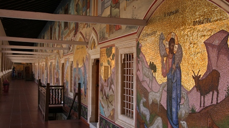 Klasztor Kykkos. Zwiedzając góry Troodos natykamy się zupełnie przypadkiem na stary, prawosławny klasztor. Ponieważ w tym momencie nie mamy żadnych innych konkretnych planów, postanawiamy przyjrzeć mu się z bliska. Na Cyprze jest sporo tego typu obiektów, ale jak do tej pory nie natrafiliśmy na żaden. Okazuje się, że klasztor pochodzi z XI wieku i nosi nazwę Kykkos, prawdopodobnie od góry, na której jest położony. Inna wersja wspomina o ptaku, który wypowiadał te słowo w ludzkim języku... Na parkingu widzę dość dużo samochodów, więc wnioskuję, że to chyba popularna atrakcja... (potem okazało się, że trafiliśmy bodajże na najbardziej okazały i największy klasztor na Cyprze). Klasztor jest do dziś aktywny, tzn. nadal pełni swoją funkcję i możemy nawet spotkać przechodzących mnichów. Wrażenia robią stare, ścienne malowidła, do zwiedzenia jest też kaplica oraz lokalne małe muzeum, jako laik mogę tylko stwierdzić, że wystawione eksponaty wyglądały na bardzo stare - niestety ale napisy cyrylicą były dla mnie nie do rozszyfrowania. Są tam starochrześcijańskie pamiątki, takie jak np. obraz Matki Boskiej namalowany przez apostoła Łukasza. Z obrazem tym wiąże się zresztą legenda klasztoru.