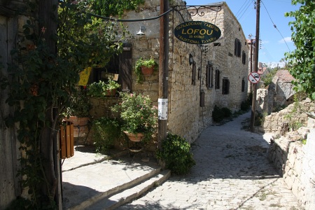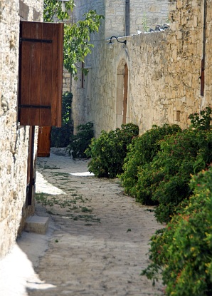 Jedna z uliczek miasteczka. Na Cyprze tubylcy się nie śpieszą, to taki południowy styl życia, więc po dotarciu do miasteczka zamiast iść do tawerny, przechadzamy się powoli po uliczkach. Trwa to dość długo i zaczynam sie zastanawiać, czy dobrze się zrozumieliśmy i na pewno przyjechaliśmy na obiad :-) Ale muszę przyznać, że spacer utkwił w pamięci dzięki wąskim i krętym uliczkom, z poziomu których mogłem się przyjrzeć miejscowemu, nieskażonemu jeszcze najazdem turystów, życiu mieszkańców oraz samej, ciekawej zabudowie. Tak, ta wioska naprawdę mi się spodobała, do tego udzielił mi się miejscowy, taki wyluzowany nastrój i spokój. Miałem wrażenie, że czas płynie tutaj jakoś wolniej... Było naprawdę fajnie.